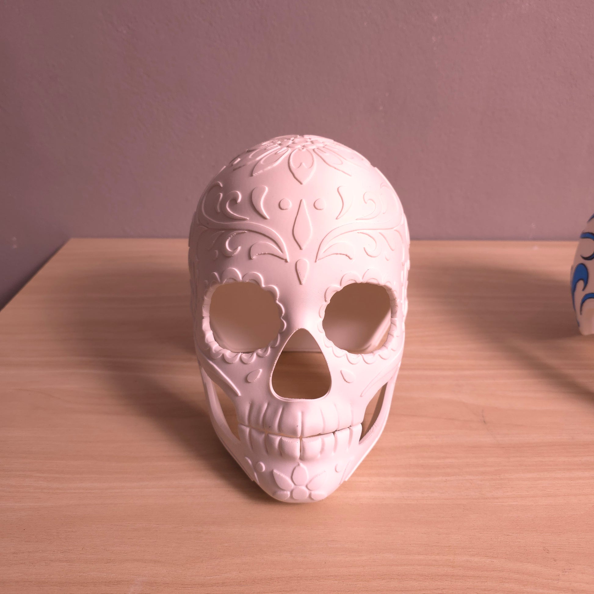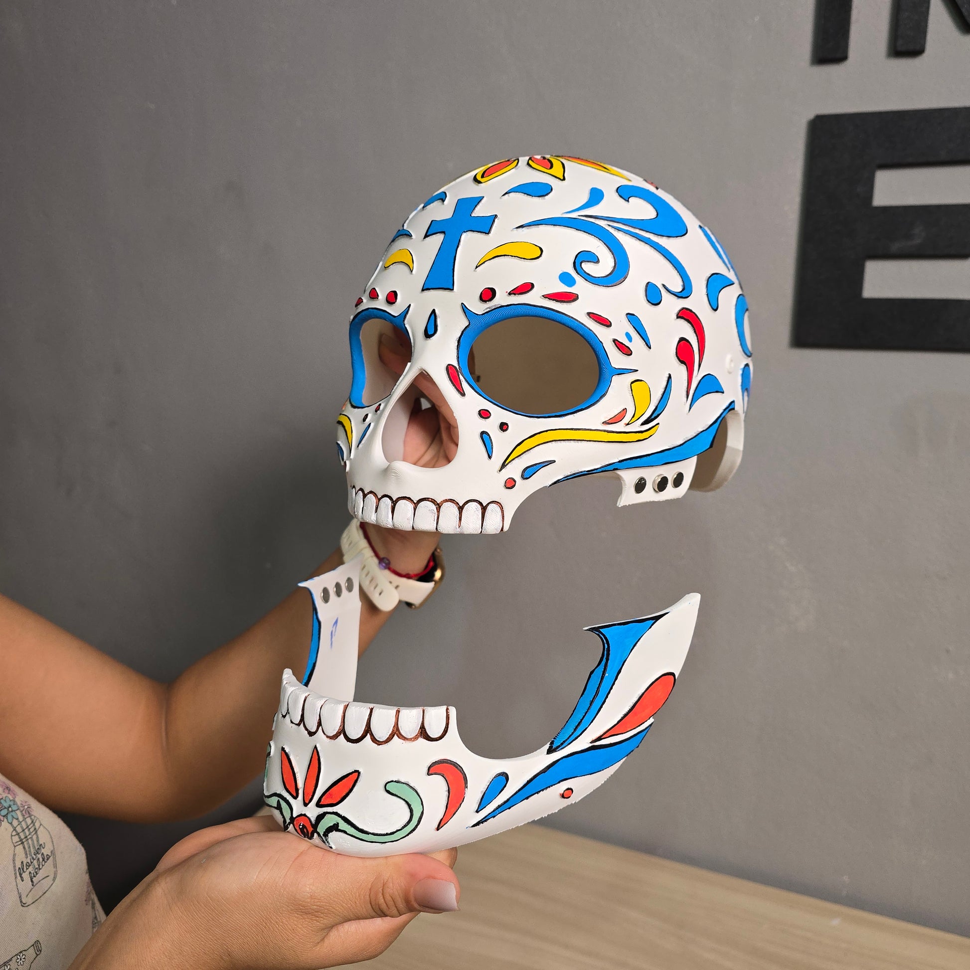 La mandíbula es magnética para poder quitársela para comer o tomar vevidas y la parte trasera de la mascara también es magnética para poder colocarsela fácilmente.